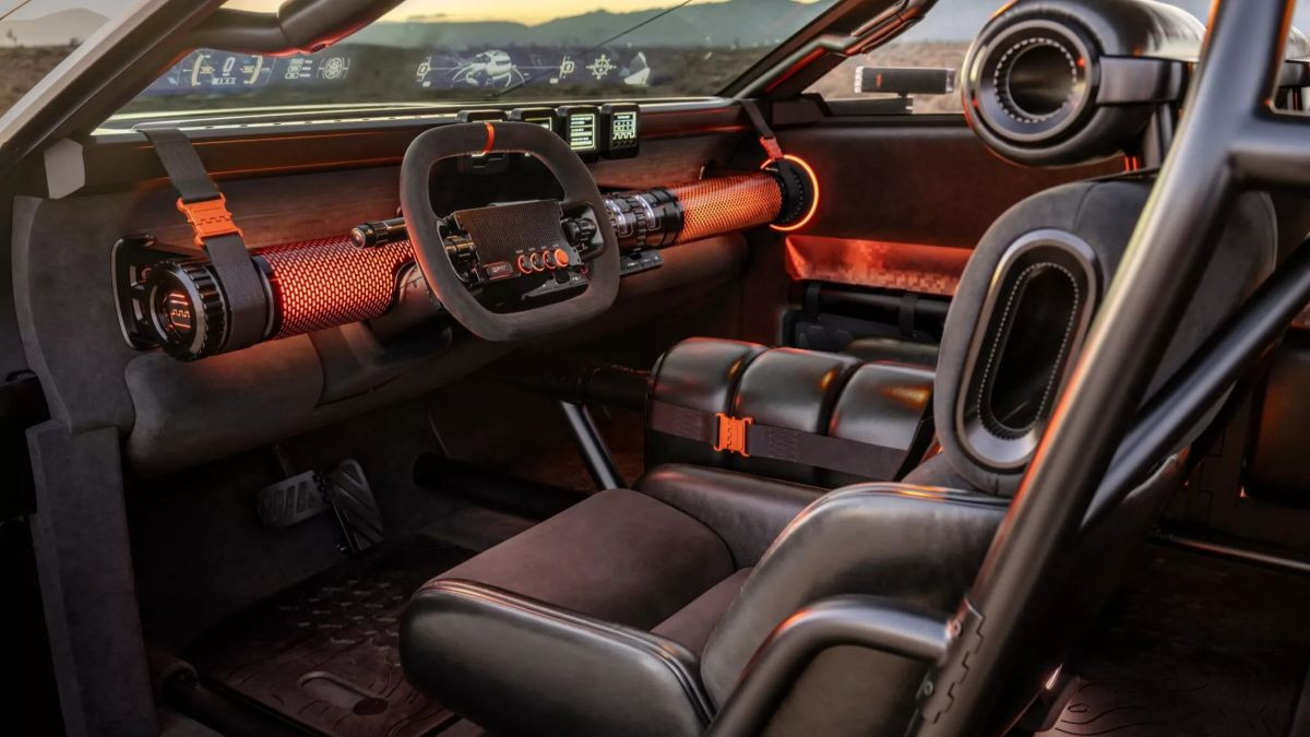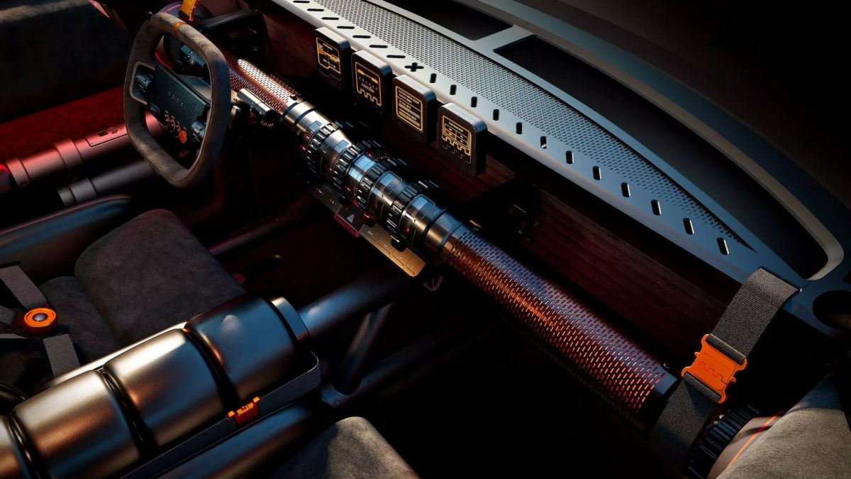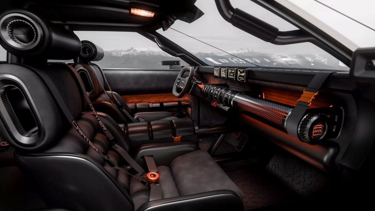 Den pikselerte Crater Man-roboten finner du også inne i utstillingsbilen. Det firkantede rattet, med nullgradersmarkering, huser knappene for valg av kjøremodus. Tradisjonelle instrumenter er fraværende, erstattet av et head-up-display og fire separate displayer midt på dashbordet. Nedenfor er fysiske kontroller formet som tannhjul. Konturbelysning omgir hele kupeen, og setene, som består av fyldige puter, er utstyrt med flerpunktsbelter.