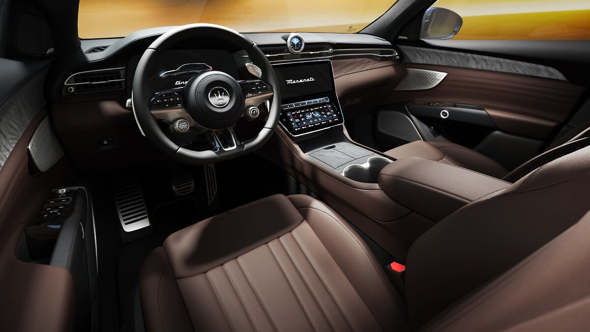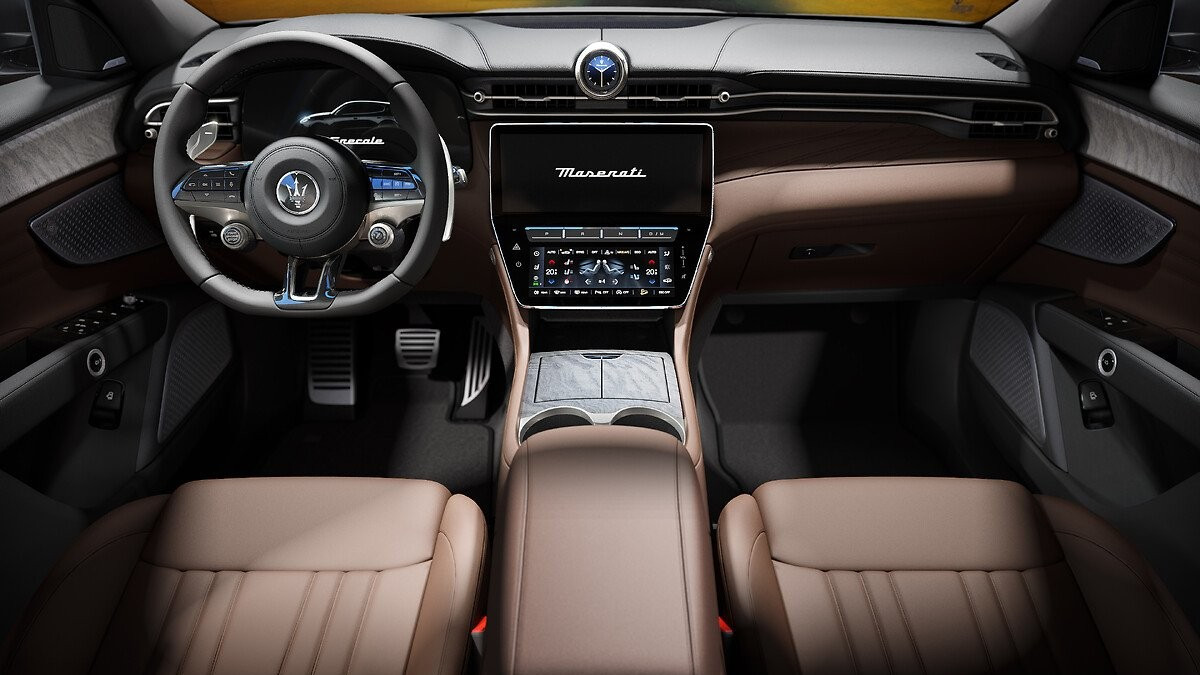 Interiøret i spesialutgaven Grecale Lumina Blu presenteres som en hyllest til kvaliteten og raffinementet til Maserati-kjøretøy. Crossoverens kupé er trukket med førsteklasses sjokoladebrunt skinn, med Ghiaccio-hvitt som et alternativ. Begge utstyrsnivåene har åpenporet treverk på midtkonsollen og dørpanelene. Pedalpanelet er utsmykket med sporty stålgrep.